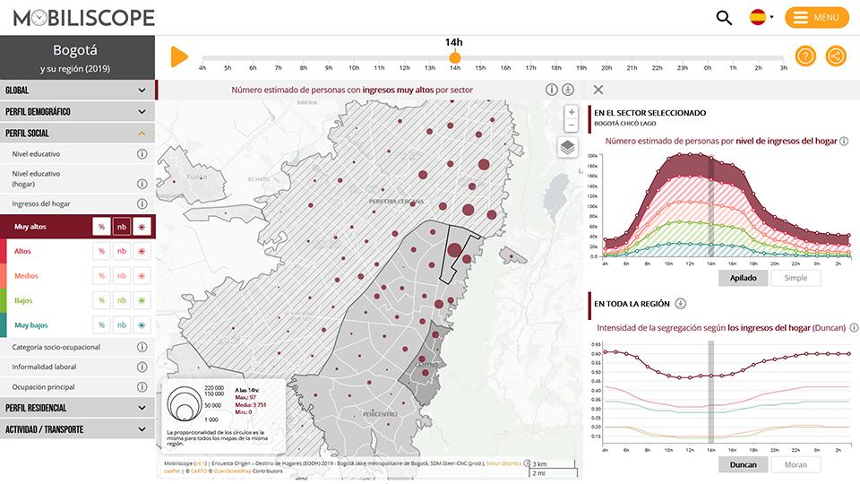 Les principales nouveautés de cette nouvelle version concernent l’ajout de ces trois villes latino-américaines avec une traduction de l’interface en espagnol, la création d’un indicateur relatif à l’informalité professionnelle (spécifique à ces villes latino-américaines) ainsi que la mise à disposition en accès libre des données associées. Avec cette nouvelle version, il est ainsi possible d’analyser la ségrégation sociale du quotidien dans ces villes latino-américaines où les inégalités sont particulièrement fortes. De fait la ségrégation des populations selon le niveau de revenus s’avère bien plus élevée que celle observée en France ou au Canada, et ce quelle que soit l’heure de la journée. On observe aussi que l’utilisation des modes de transport doux (marche, vélo) relève de logiques très différentes : alors que les modes doux constituent le mode principal de déplacement des populations présentes dans les centres des villes françaises et canadiennes, ce sont à l’inverse par les populations présentes dans les périphéries populaires des villes latino-américaines qu’ils sont les plus utilisés.